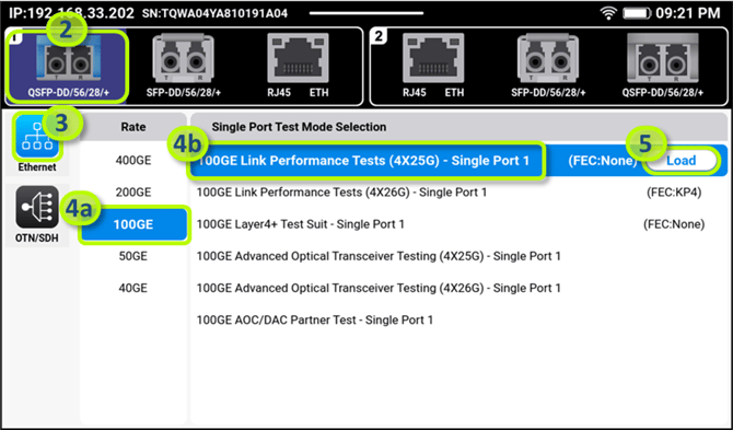 - Select the Data Rate and Test Mode to match the link under test (e.g. 100G Ethernet Testing or 100GE Link Performance Tests)