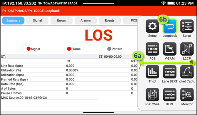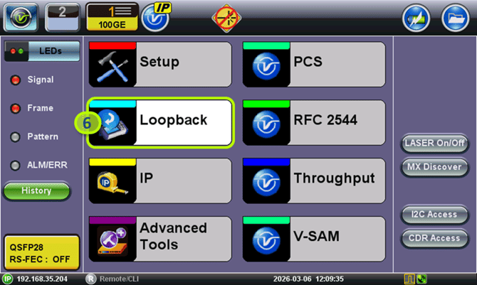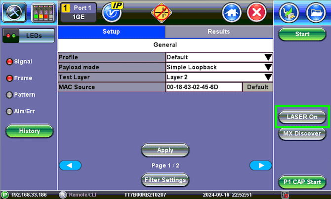 - If an optical interface was selected, tap on the LASER button to turn the transmitter ON and verify that the yellow Active Laser icon