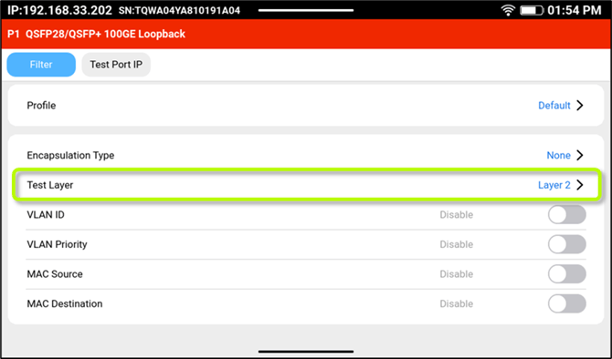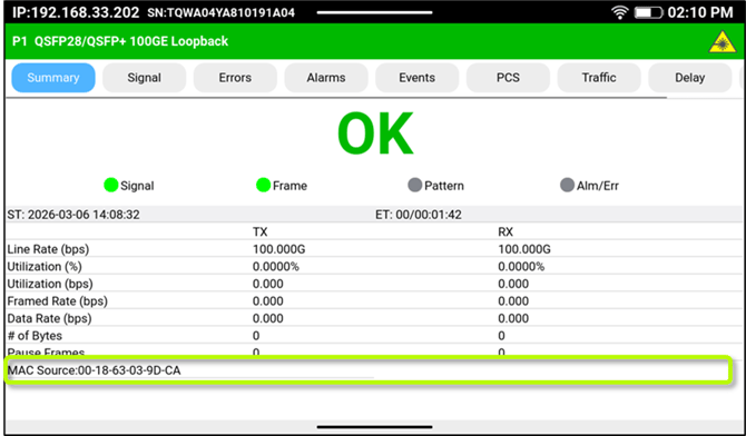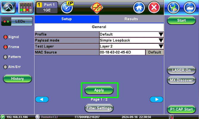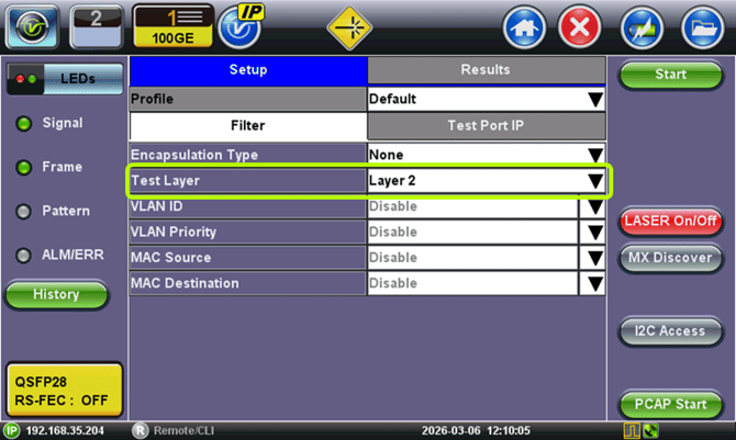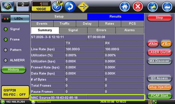 - Let the person at the other end of the link (e.g., NOC) know the MAC Source or IP address of the loopback test set, so they can enter it in their setup and start generating the respective Layer 2 or Layer 3 test traffic towards the far-end test set, to run all the required troubleshooting or validation tests.