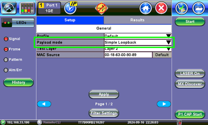 - If offered, in the Setup screen, select the Simple Loopback payload mode to return all the traffic directed towards the test set. (If using the MTX642 or MTX640, swipe up from the bottom of the screen ti display the test application menu and tap Setup)