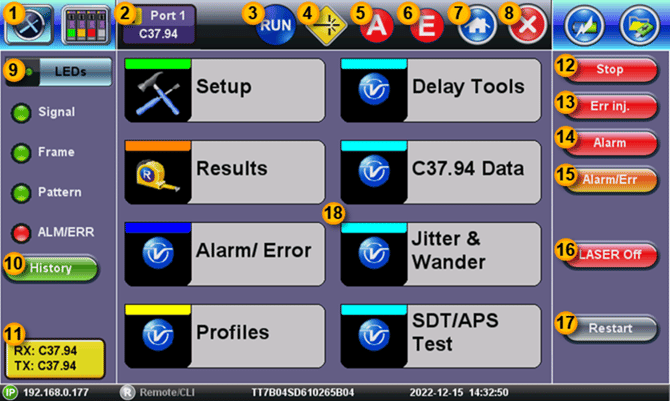 - Interface Status – Shows that the test set’s interface is configured to transmit and receive C37.94 signals.