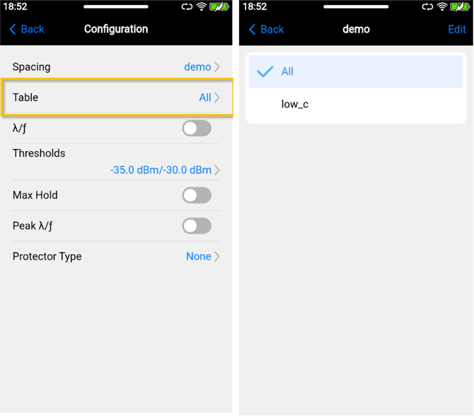 Tap on Table and notice only tables enabled in the profile are listed. Select the desired channel table to run the test.